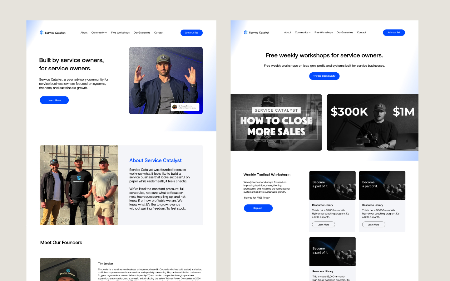 Service Catalyst needed a simple yet highly professional website for their business community and coaching program. The site had to feel custom, conversion-focused, and far from templated while seamlessly guiding potential clients toward taking action through clear, strategic calls-to-action and an intuitive user experience.